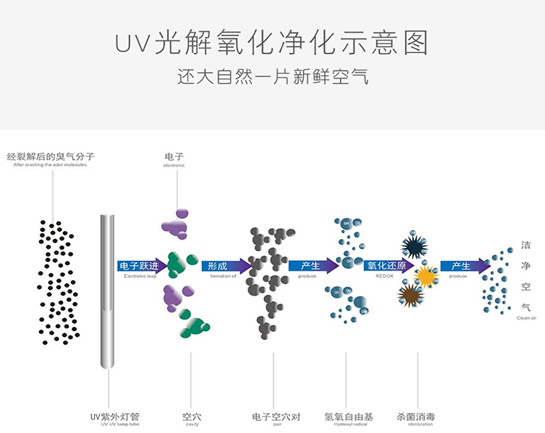 UV燈管在啟動之後(hòu),能夠(gòu)產生大量的紫外線光速對惡臭(chòu)氣(qì)體進行照射,將惡臭氣體(tǐ)降解轉化,變成低分子化合物【UV+O2→O-+O*(活性氧)O+O2→O3(臭(chòu)氧)】,例如變(biàn)成CO2、H2O等無(wú)害氣體,達到有效的去除異味的效果,且不(bú)會產生二次汙染。例如變成CO2、H2O等無害氣體,達到有(yǒu)效的去除異味(wèi)的效果,且不會(huì)產生二次汙染。