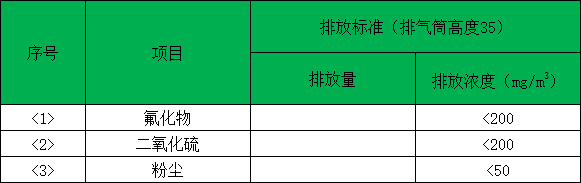 (8)排(pái)放標準,執行以下排放要求:二氧化(huà)硫濃度<200mg/m3 ,氟化物濃(nóng)度<200mg/m3,粉塵濃度<50mg/m3並具有(yǒu)可滿足更高標準的調節裕量。